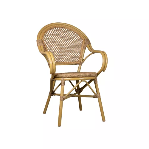 The Alvo terrace chair features UV-resistant wicker in a refined webbing design, ensuring excellent colour retention and a long-lasting appearance, even with intensive outdoor use. Its powder-coated aluminum frame is built to resist scratches and daily wear. Practical in every sense, the Alvo is fully stackable, allowing for quick and space-efficient storage.