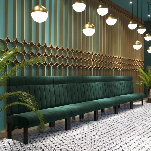 This custom-made American diner bench brings retro charm to any hospitality space. Built with high-density foam, it offers long-lasting seating comfort even in high-traffic environments. The bench can be tailored in a wide selection of professional fabrics or synthetic leathers to suit your brand or interior concept. For complete personalization, you also have the option to provide your own upholstery material.