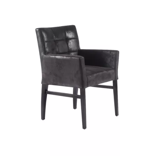 Bernard A Square Capitons is a refined wooden chair with armrests, designed for comfort and durability in horeca spaces. Featuring a solid beech wood frame available in multiple stain finishes, it includes decorative capitons stitching on the backrest and upholstery in professional fabrics or faux leather, suitable for high-traffic interiors.