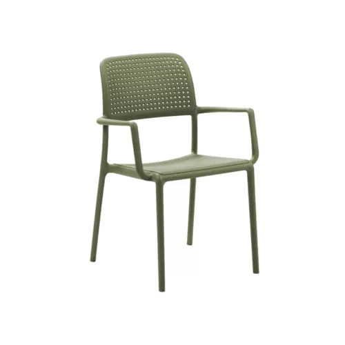 Bora is a durable and lightweight outdoor chair made of recyclable polypropylene with UV additives. The monobloc structure and armrests ensure stability and comfort. Stackable and available in multiple colors, it’s ideal for horeca terraces and other exterior spaces. A practical solution that combines design, strength, and functionality.