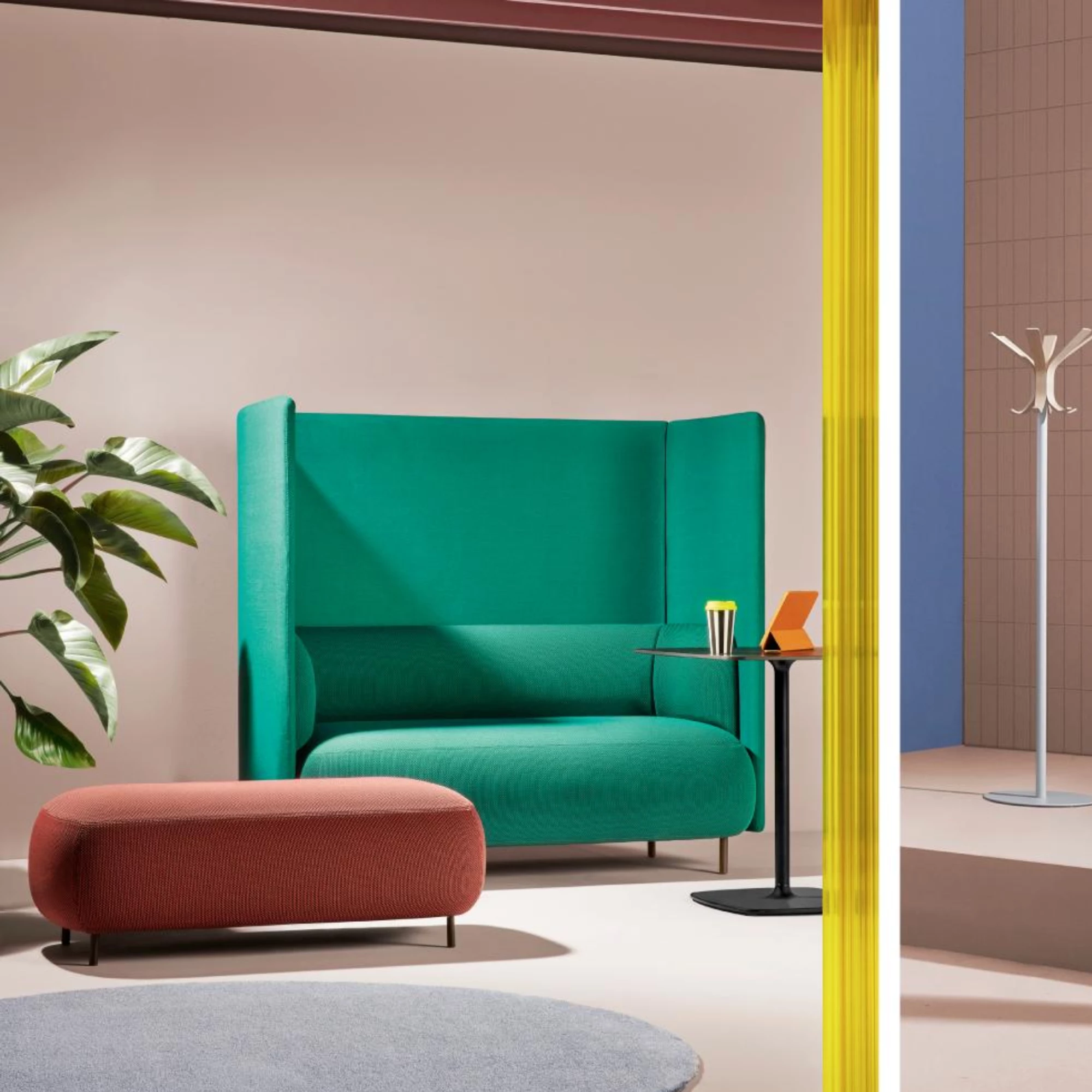 This functional and efficient seating solution creates a softly enclosed alcove that offers both acoustic and visual privacy, perfectly aligned with the evolving needs of modern office and collaborative spaces. A wrap-around, sound-absorbing panel with a height of 1400 mm gently embraces the seat, forming a private niche ideal for focused work or relaxed conversation. The seat, backrest and armrests are upholstered in injected polyurethane foam and supported by elastic belts, while the sturdy steel frame and aluminium legs ensure long-lasting stability. For added functionality, integrated sockets can be included, allowing easy connection of charging devices.