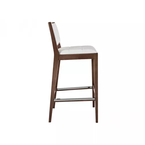 The Cassie 2 BK barstool blends timeless design with refined details. Crafted from beech wood, its frame is available in various stain finishes and features a wooden footrest with metal protection. The upholstered seat and backrest, accented with square stitch details, offer elegance and comfort—ideal for bars, event halls, and horeca venues.