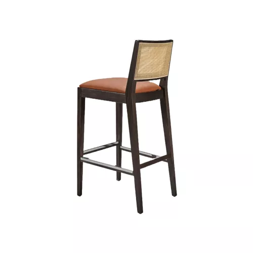 The Cassie BK Straw barstool combines natural warmth with refined comfort. Its beech wood frame, available in multiple stain finishes, features a wooden footrest with metal protection for durability. The upholstered seat and elegant cane backrest create a sophisticated look, ideal for bars, cafés, and other horeca spaces.