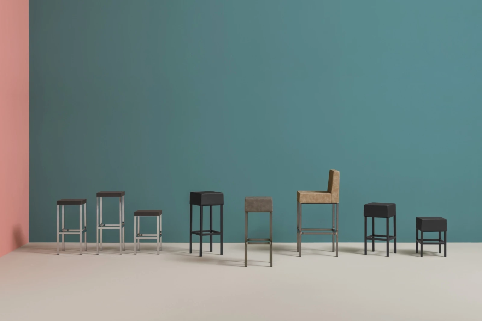 The Cube barstool draws inspiration from a pure and simple geometrical language. It features an upholstered seat in fabric, leather, or simil leather and a sturdy 25x25 mm steel tube frame. Thanks to its compact dimensions, Cube is ideal for optimizing space in interior settings such as bars, restaurants, or cafés.