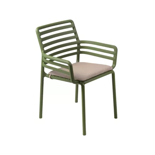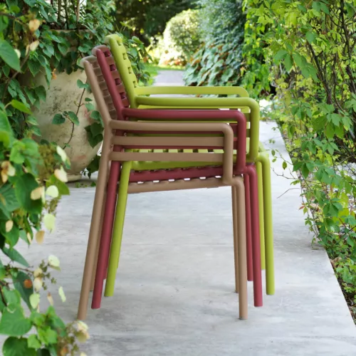 The Doga A is a monobloc chair with armrests, designed for both comfort and style. Made from uniformly colored fiberglass polypropylene resin with UV additives, it is durable, weather-resistant, and recyclable. The chair features a matt finish, non-slip feet, and is stackable for easy storage. Available in a wide range of colors: white, anthracite, cappuccino, mint, agave, pear, marsala, and tobacco. A matching cushion is available on request.
