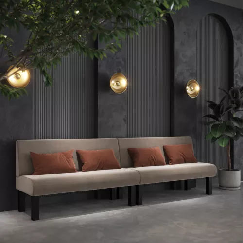 Donald with Legs is a custom-length dining bench featuring a solid beech wood frame and high-density foam seating for lasting comfort. Designed for both style and durability, it can be upholstered in a wide variety of professional fabrics to suit any horeca interior. The sturdy frame and refined finish make it ideal for busy dining environments.