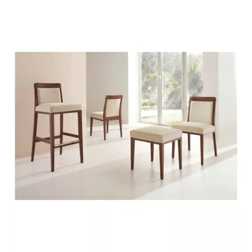 Dubai S is a durable chair featuring a beechwood frame coated with polyurethane lacquer for enhanced resistance to heavy use. It boasts an upholstered seat and backrest, filled with high-resolution foam to ensure long-lasting comfort and durability. Offered in various wood colors and customizable with a wide range of professional fabrics or faux leather, Dubai S fits any stylish interior.