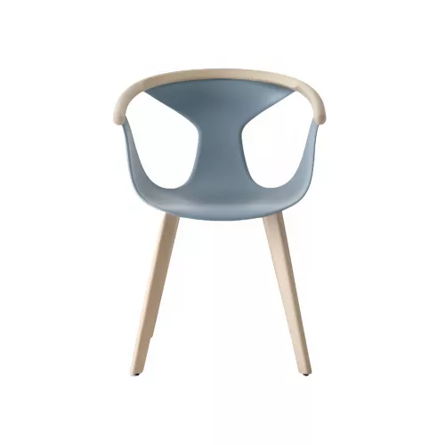 It features a fiberglass-reinforced polypropylene shell, antistatic and UV-resistant, a curved backrest in solid ash wood, and matching ash legs with a matte, scratch-resistant finish.