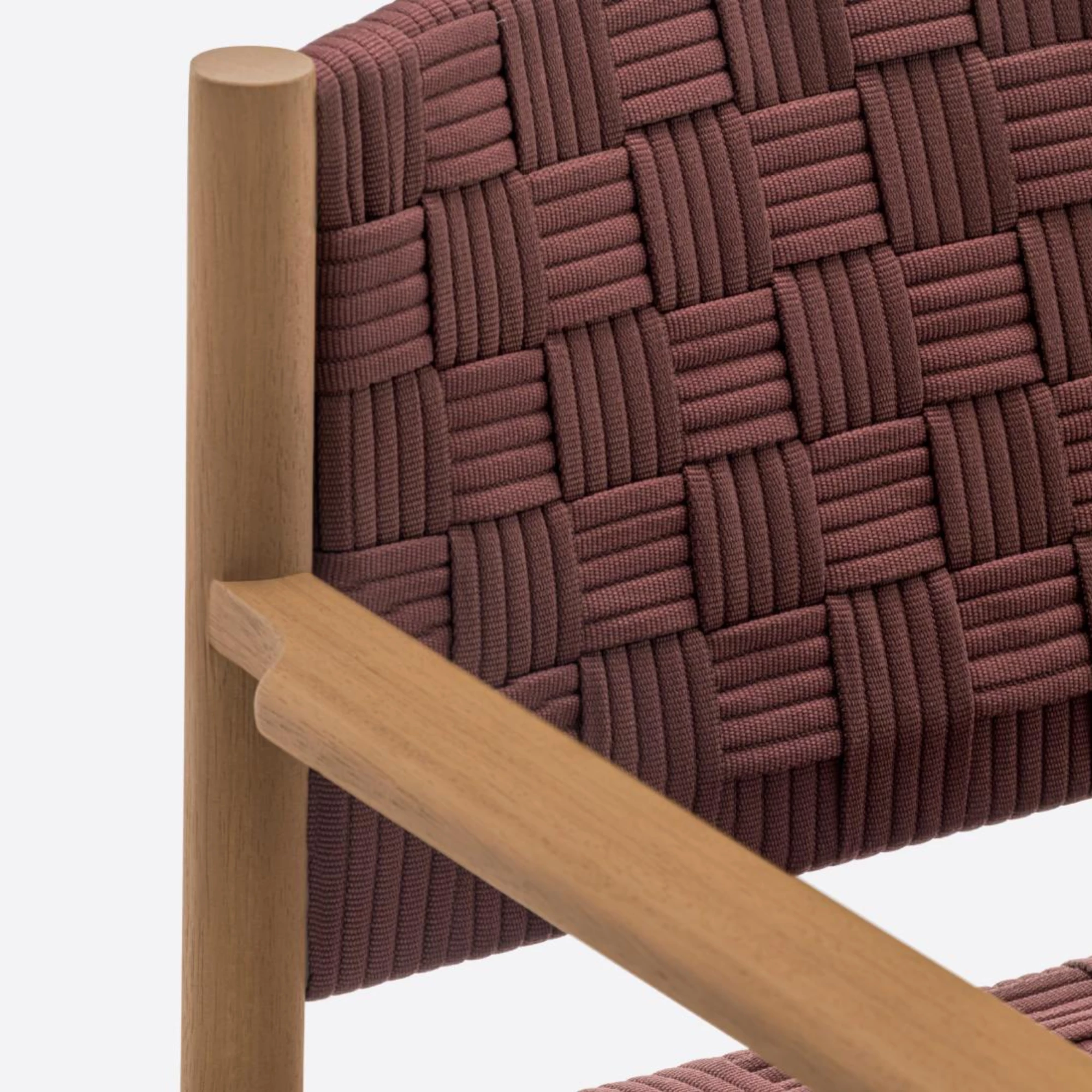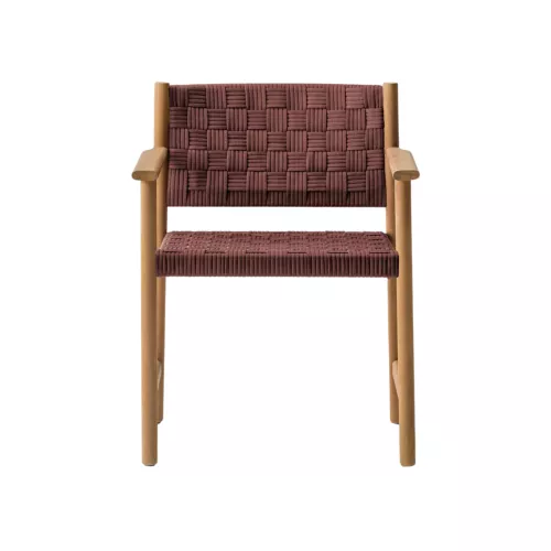 Griante reinterprets the art of woven seating with a design that harmoniously blends traditional craftsmanship and modern industrial production. This outdoor armchair features a refined teak frame, FSC® C114358 certified, with turned cylindrical legs and elegantly tapered oval armrests that flow seamlessly into the back legs. An aluminium frame supports the seat, ensuring both strength and lightness. The defining element of Griante is its handwoven seat and backrest, crafted in Italy from fully recyclable polypropylene yarn belts with a distinctive three-dimensional texture. This material guarantees comfort, durability, and weather resistance, while allowing for easy disassembly and maintenance — a perfect balance of aesthetics, sustainability, and functionality.
