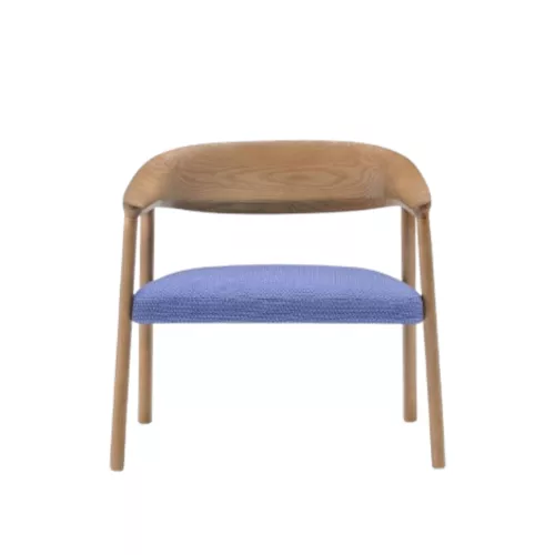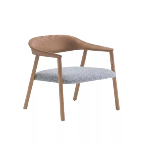Héra 2869 is an indoor lounge armchair in ash wood, featuring a sculptural wrap-around solid back that flows into rounded rectangular legs. Its seat, padded with flexible polyurethane foam and supported by elastic straps, offers lasting comfort—an elegant, durable choice for refined restaurant spaces.