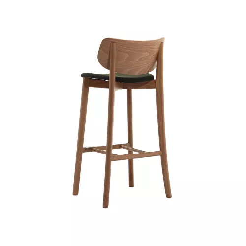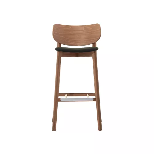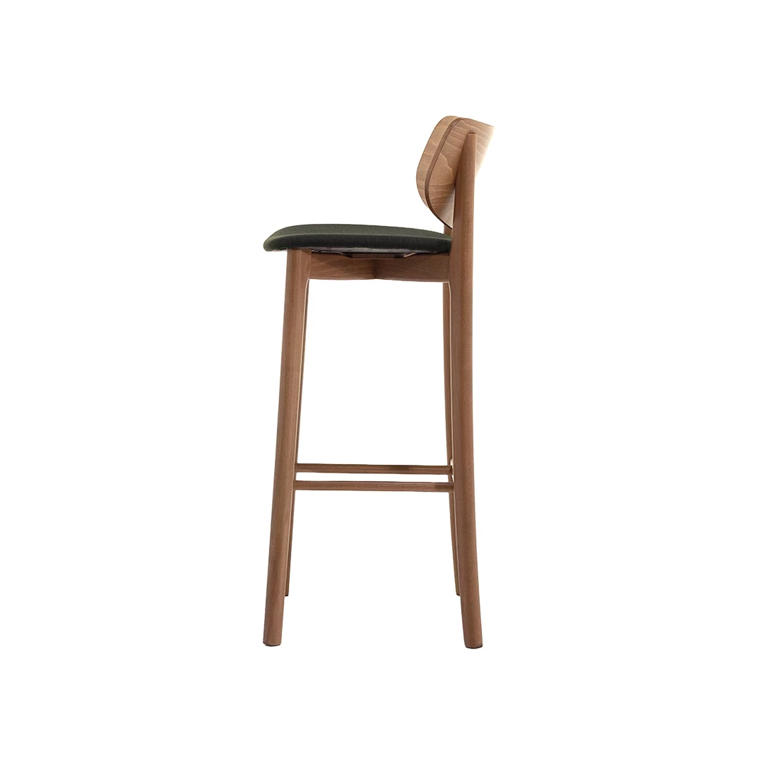 The Javiro BK UPS wooden barstool combines elegance, comfort, and versatility. Its solid beech wood frame, aluminum-protected footrest, upholstered seat, and wooden backrest offer durability and style. Defined by simple yet characterful lines, it adapts effortlessly to any contemporary or classic horeca environment.