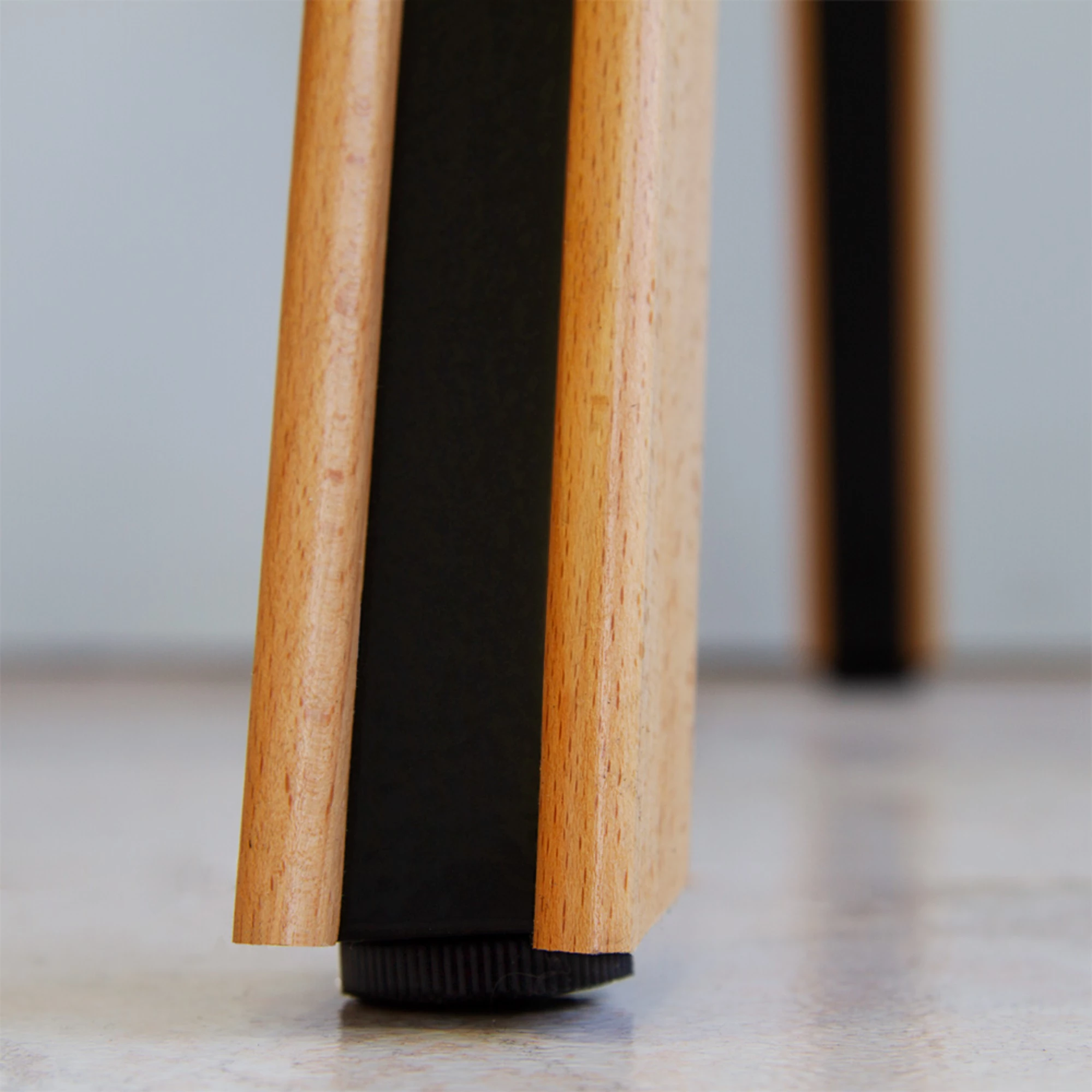 Jean W is a refined table base designed for horeca spaces, combining an iron core with a beech wood slat exterior in various finishes. It includes a steel cross and adjustable feet for stability. Delivered disassembled for easy transport. Compatible with tops up to 90x90 cm or ⌀100 cm. Ideal for diverse horeca interiors and design styles.