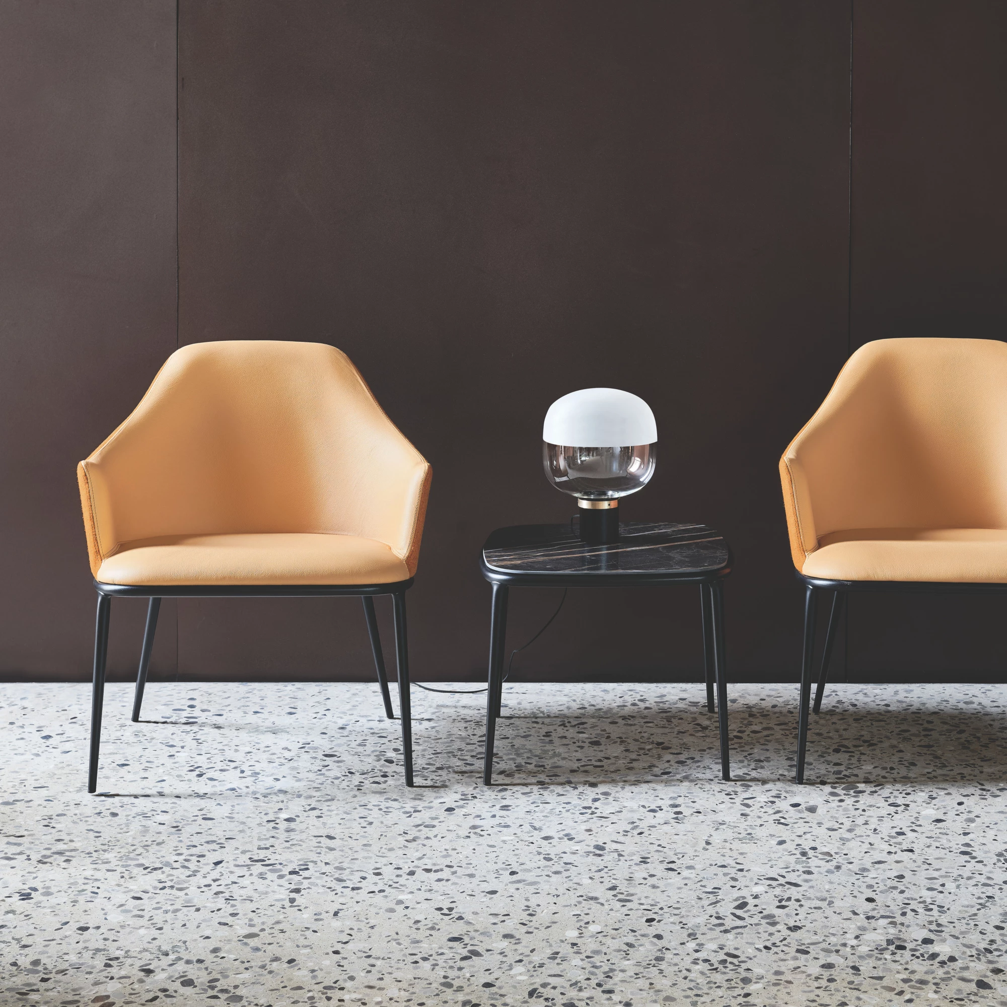 Lea AP M TS is a refined lounge armchair designed for horeca environments. Its sturdy metal frame is available in multiple colors with either a matte or glossy finish. Fully upholstered, it offers a broad choice of professional fabrics or faux leather. Ideal for lounges, hotel lobbies, and other stylish commercial interiors seeking elegance and comfort.