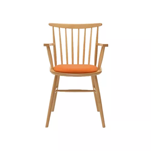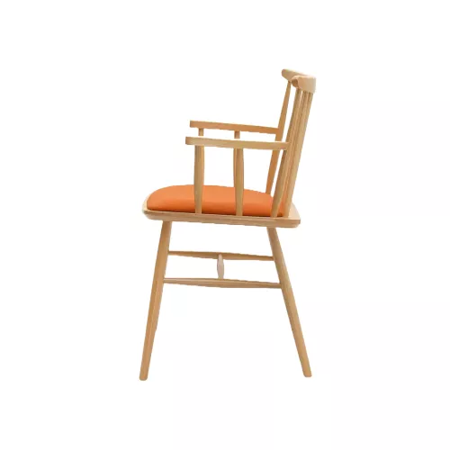 The Louisiana A UPH chair with armrests combines traditional design with trendy vintage style. Its profiled frame, slim hand-ground back rungs, and arched crossbar complement a unique horseshoe-shaped seat. Crafted from beech wood, it features an upholstered seat and wooden backrest, available in multiple wood colors and fabrics or faux leather—perfect for HoReCa interiors.