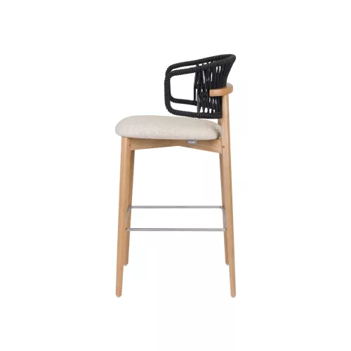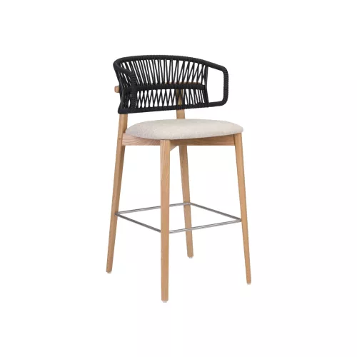 The Nebulas BK is a premium wooden barstool crafted for horeca environments. Its ash wood frame is available in various stain finishes, paired with a durable metal footrest. The seat is upholstered in professional-grade fabrics, while the hand-woven cord backrest adds a unique visual texture. Ideal for stylish bar areas, lounges, and hospitality interiors.