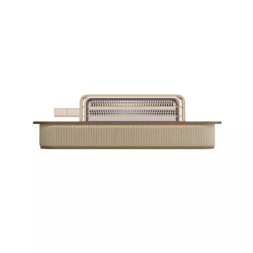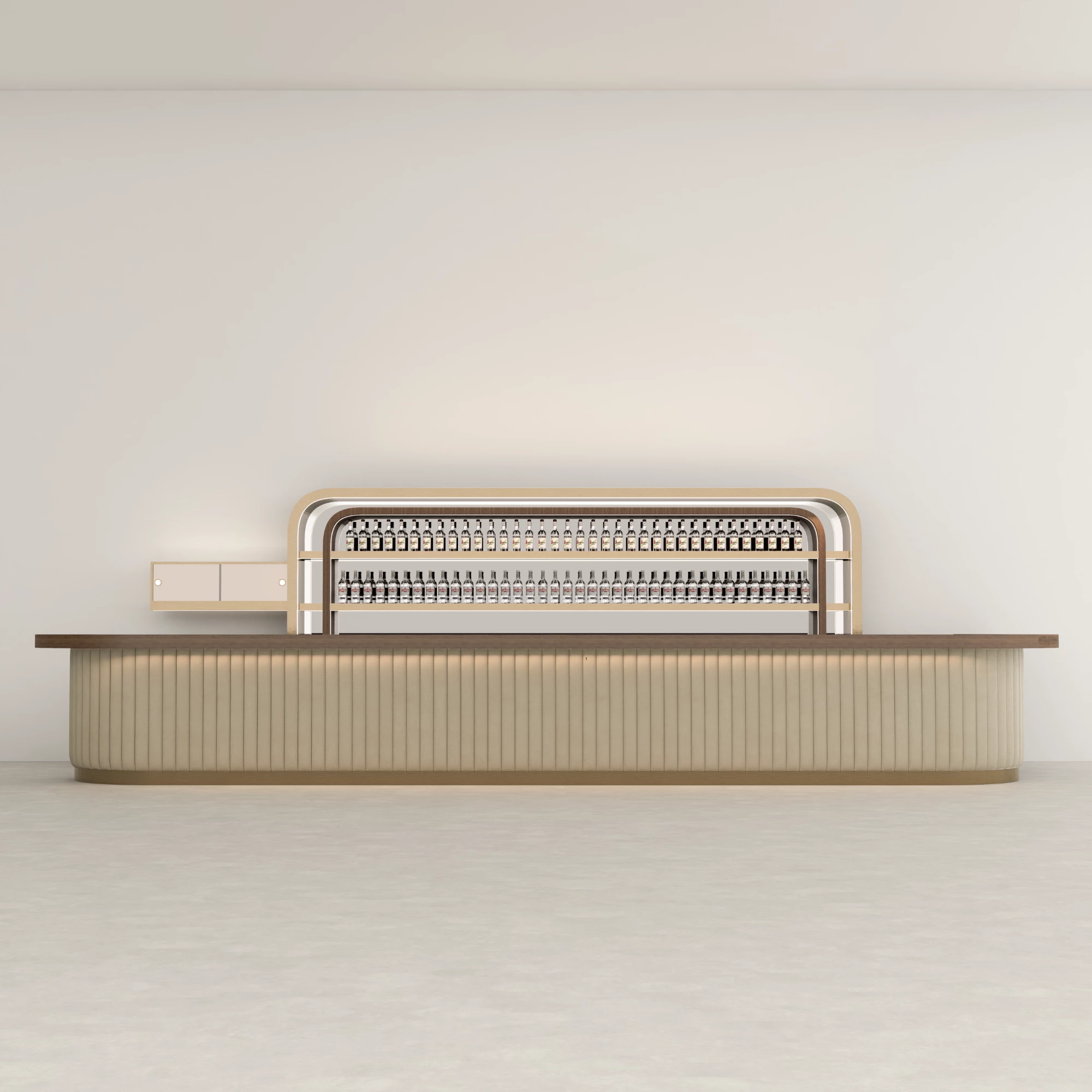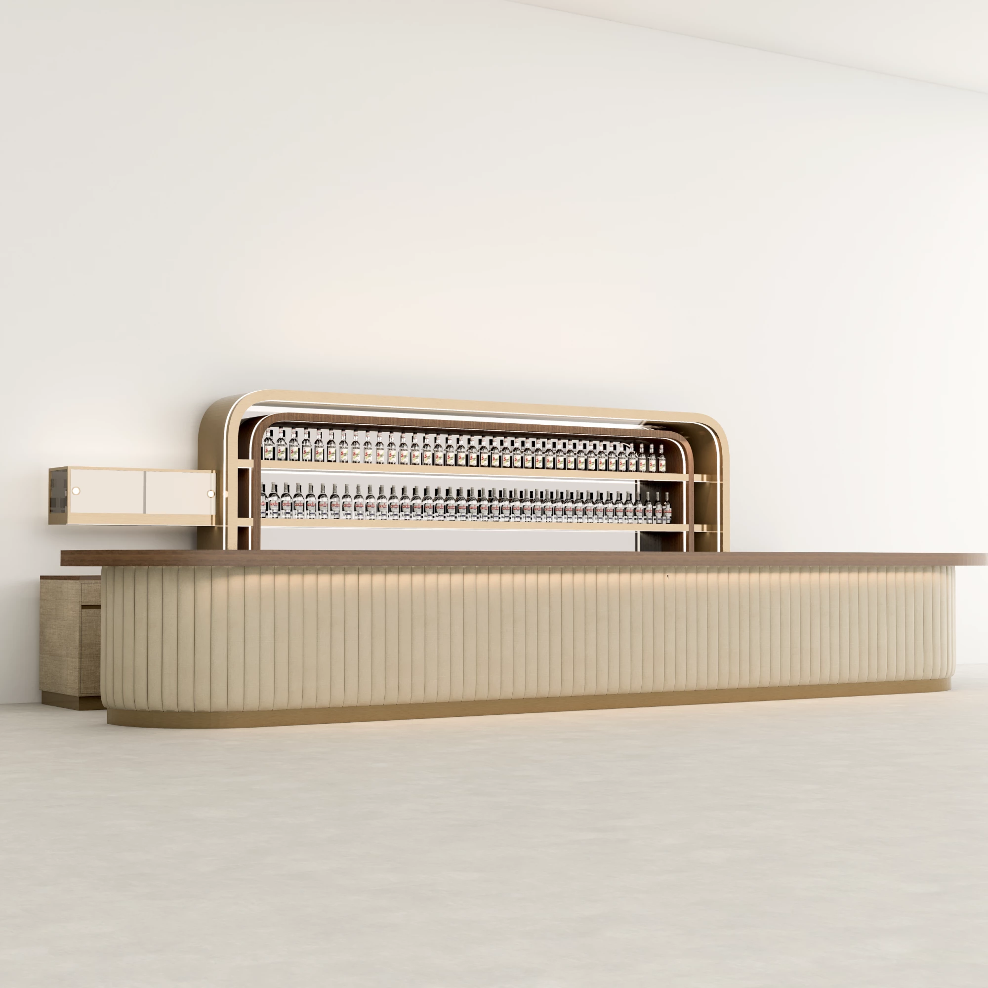 The front of the bar features vertical rolls upholstered in a luxury Almond-coloured fabric, adding tactile richness, sophistication, and visual rhythm. Below, the plinth is finished in brushed bronze HPL, grounding the bar with a warm metallic accent.