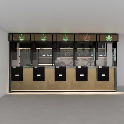 The front counter is finished with a special hand-applied painting technique in a refined gold shade, sealed with a clear lacquer for a smooth, radiant, and long-lasting finish. Beneath, a black LED-lit plinth creates an elegant floating effect, highlighting the sculptural lines of the bar.