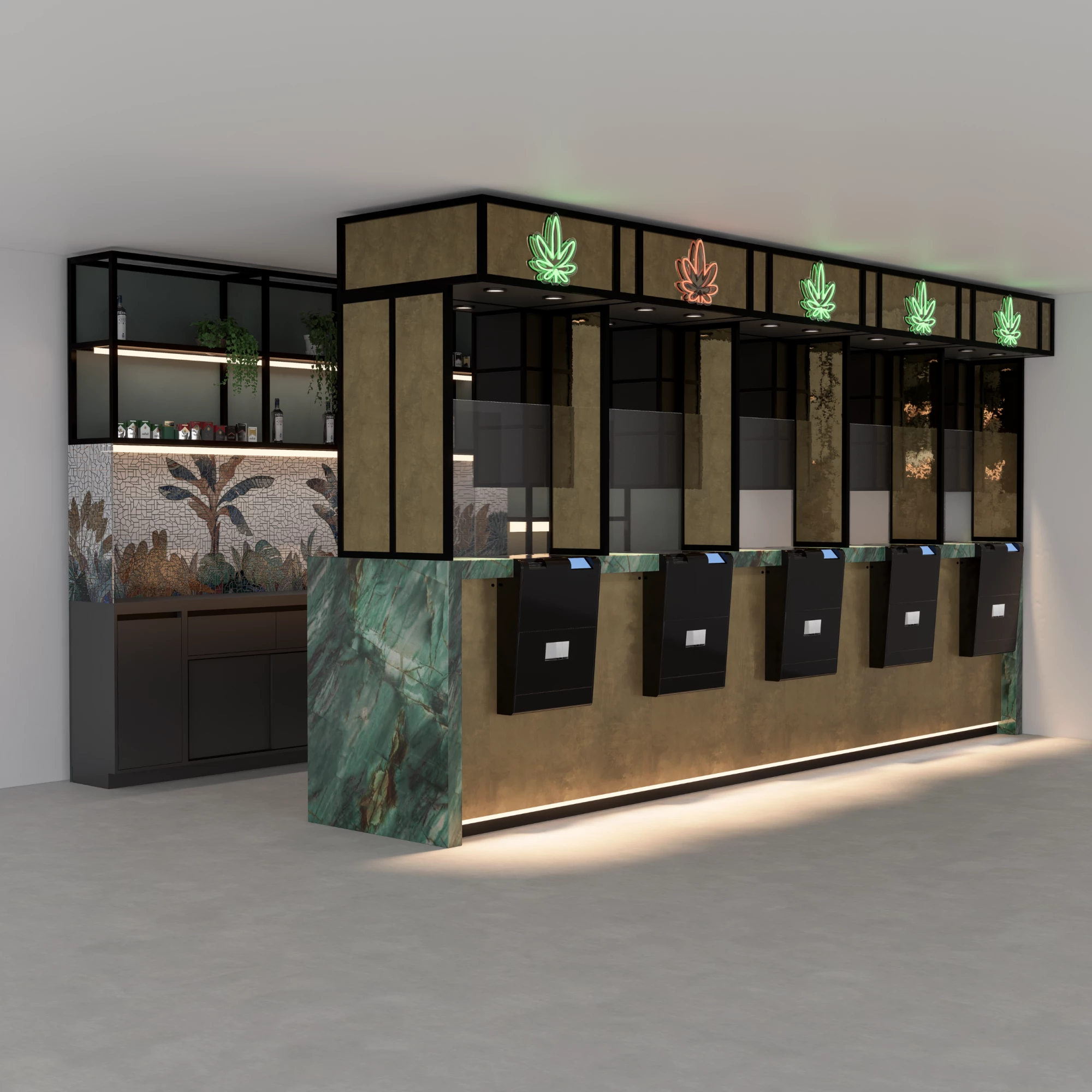 A striking contemporary bar concept defined by deep contrasts, rich materials, and a quiet touch of luxury. The service top and side panels are crafted from Marble Rainforest Green, offering a dramatic natural texture with warm earthy veining that instantly becomes the visual anchor of the design.
