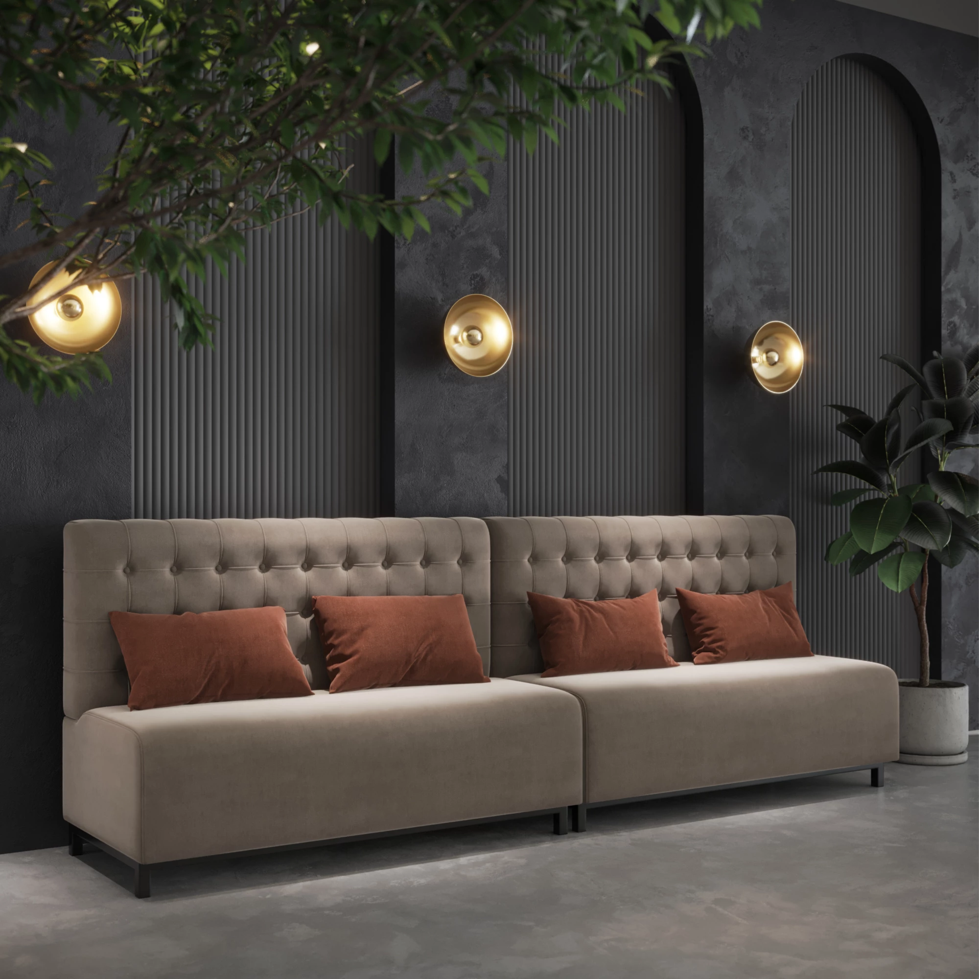 The Qvadro Bench offers contemporary elegance and practicality for restaurants, cafés, and bistros. Equipped with a choice of black or standard melamine base (sockel) and solid birch timber legs, this bench guarantees strength and modern style. Its back side is intentionally left non-upholstered for easier integration against walls or partitions, while the seat features premium upholstery for guest comfort. The fabric consumption is calculated at 2.8 m per linear meter with the back unupholstered, or 3.8 m per linear meter with the back upholstered if desired. Robust, versatile, and designed for the demanding hospitality sector, the Qvadro Bench creates inviting, stylish seating to elevate any interior space.