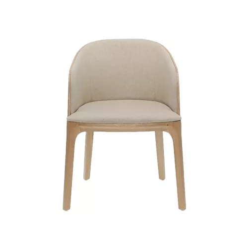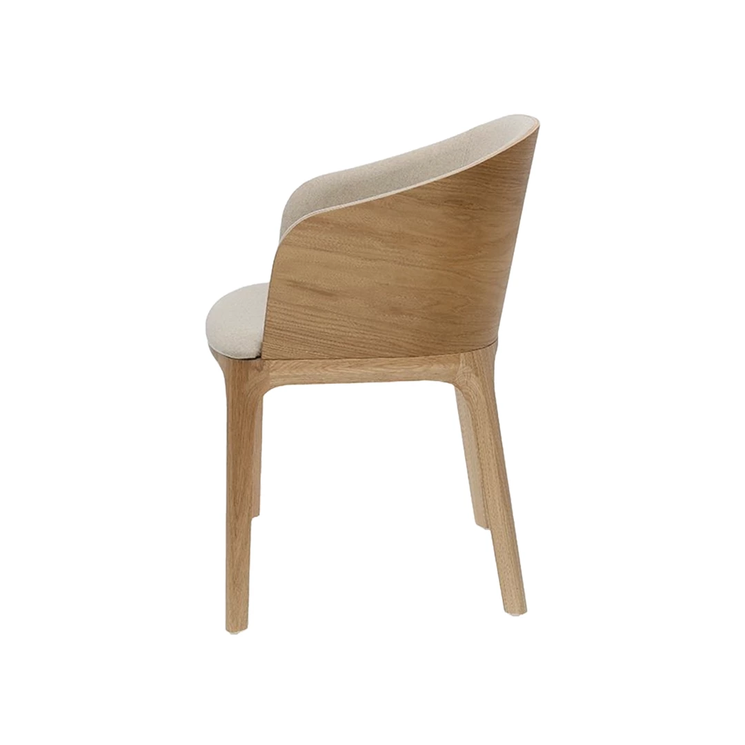 The Rainbow A upholstered chair with armrests blends classic elegance and modern design. Its simplified form and exposed natural wood backrest highlight the beauty of craftsmanship. Made with a durable beech wood frame and subtle plywood structure, it offers comfort and style. Available in various wood stains and upholstery options, perfect for HoReCa spaces.