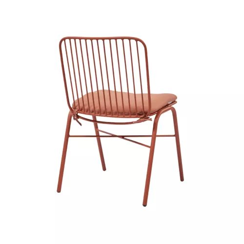 Outdoor chair with a metal frame and a comfortable seat cushion, designed for hospitality terraces and outdoor dining areas. The slender vertical lines of the backrest create a light and balanced appearance, while the sturdy metal structure ensures durability in intensive use environments. Suitable for cafés, restaurants, patios, and terrace seating areas where both comfort and practical design are required.