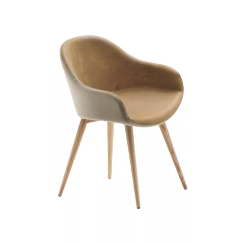 Sonny armchair with four-legged metal base. Upholstered seat available in leather, faux leather, or fabric. Option to upholster the front and back in different materials or colors.