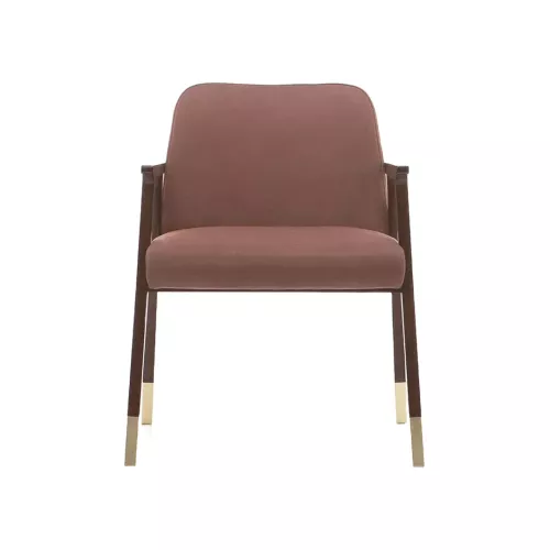 The Tenuo A chair combines timeless elegance with modern comfort, inspired by 20th-century design masters. Featuring armrests, a solid beech wood frame, and refined brass ferrules, it exudes sophistication. Its upholstered seat and backrest, available in various fabrics or faux leather, make it ideal for stylish HoReCa interiors.