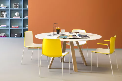 The Tweet 895 armchair merges a sleek, double-injection polypropylene shell with integrated armrests and a Ø14 mm steel-tube frame in either chrome or powder-coat. Antistatic and UV-resistant, this stackable seat (up to 10 high) offers contract-ready versatility in mono- or bicolor finishes.
