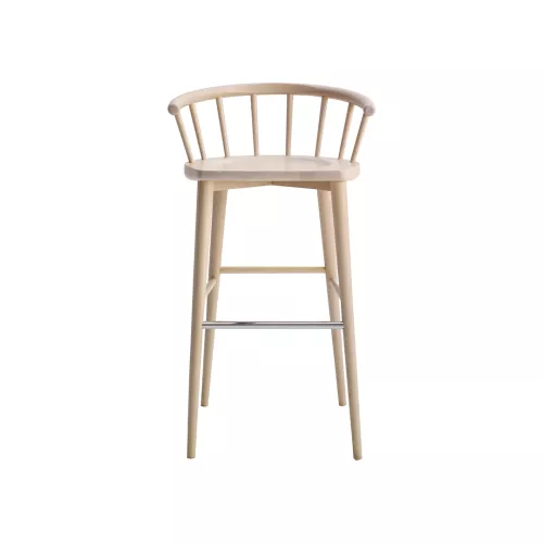 W 607 is a refined wooden barstool designed for demanding horeca environments. Crafted from beech wood, its seat and backrest are shaped with precision to ensure a visually balanced and ergonomic profile. The stool features a sturdy metal footrest and is available in various wood stains or optional RAL colors. A perfect fit for stylish commercial interiors.