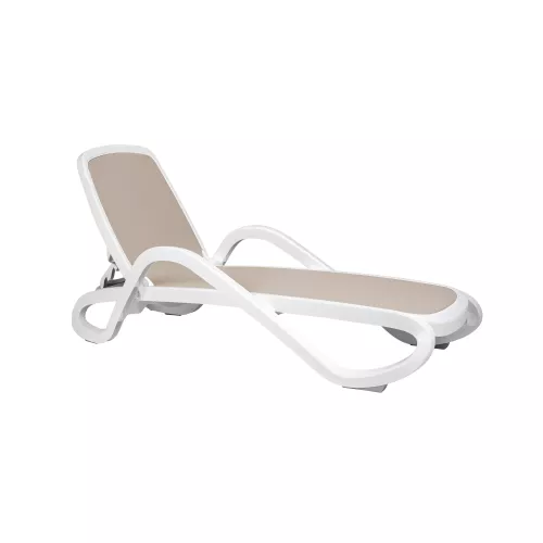 Sunlounger designed for outdoor comfort, featuring armrests and a tubular resin frame combined with breathable synthetic fabric. The adjustable backrest offers four reclining positions, allowing users to relax at their preferred angle. Available in multiple frame and fabric colour combinations, this sunlounger is stackable, making it a practical choice for terraces, poolsides, and hospitality outdoor areas.