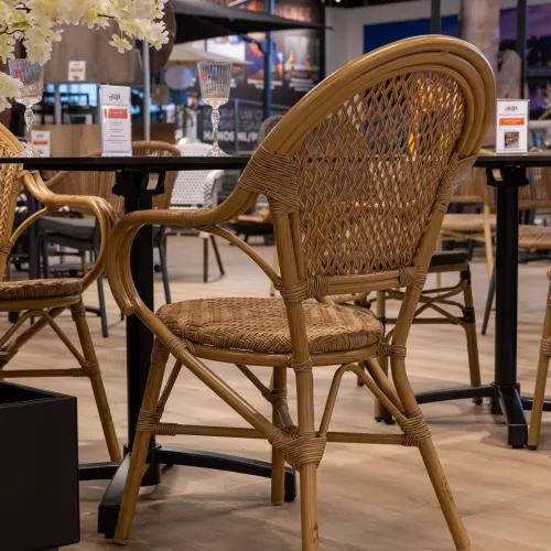 The Alvo terrace chair features UV-resistant wicker in a refined webbing design, ensuring excellent colour retention and a long-lasting appearance, even with intensive outdoor use. Its powder-coated aluminum frame is built to resist scratches and daily wear. Practical in every sense, the Alvo is fully stackable, allowing for quick and space-efficient storage.