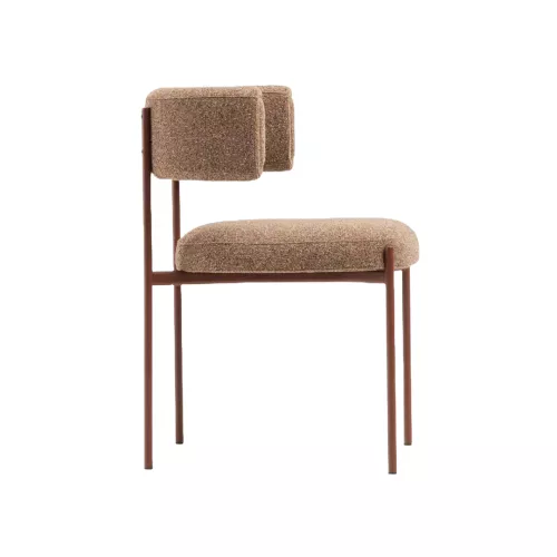 The Amelie Chair upholstered with armrests strikes a bold balance between retro charm and contemporary design. Its four-legged metal base, available in multiple colors, supports a fully upholstered seat and backrest. Customization allows different fabrics or colors for the shell, including a contrasting front insert for the backrest.