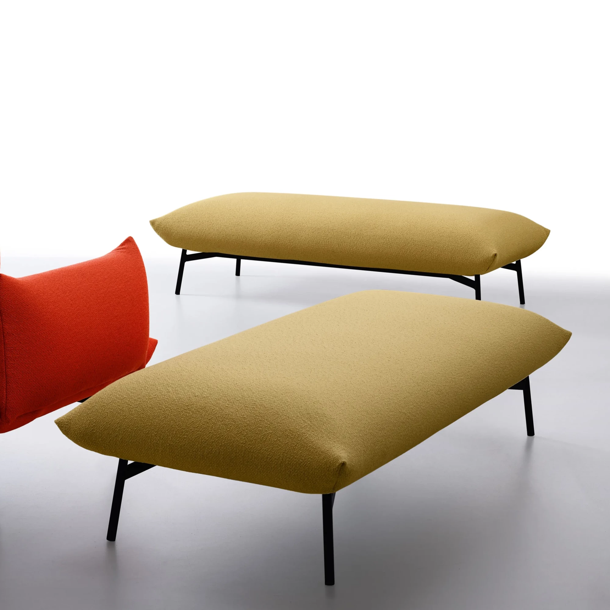 Area Pouf B2 M TS is a two-seat upholstered pouf tailored for horeca spaces. Its soft cushioned seat is supported by a lacquered steel frame available in various colors. Upholstered in high-performance fabrics, it fits effortlessly into lobbies, lounge areas, or waiting rooms with contemporary or classic design styles.