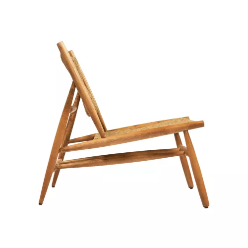 Wooden lounge chair with a woven seat and backrest made from rattan cord.