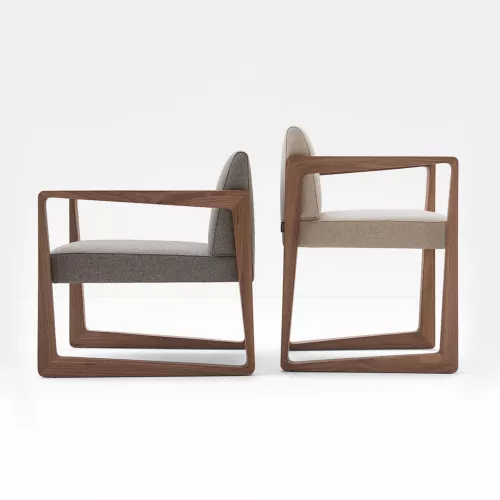 Askew 5C35 is a refined chair with armrests, crafted from durable beech wood and available in a wide selection of stained or RAL finishes. Its upholstered seat and backrest come in high-performance fabrics or faux leather, perfect for horeca settings. A blend of modern and classic lines makes it versatile for many interior design concepts.