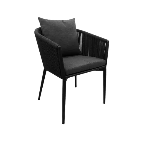 Beatrice A is a stylish outdoor chair with armrests, built for durability and elegance in horeca settings. It features a robust Aluminium frame in charcoal or white, paired with a seat available in dark or light grey. Perfect for terraces or any outdoor hospitality space, it combines comfort and weather resistance.