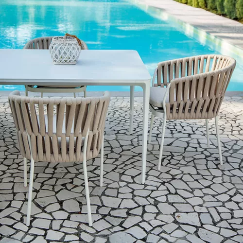 Boho is a sturdy and stylish outdoor armchair, crafted with a durable Aluminium frame and covered with elegant acrylic rope. It includes an upholstered cushion in Olefin fabric for added comfort. Stackable and weather-resistant, Boho is perfect for any HoReCa terrace, combining functionality with a relaxed aesthetic.