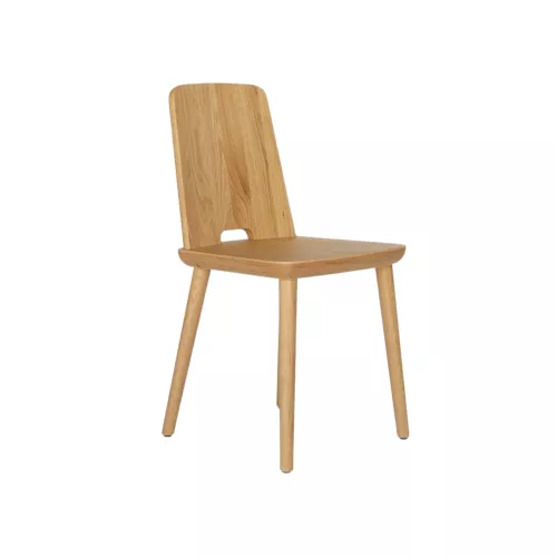 The Bregenz chair is made from natural ash wood, featuring a linear and versatile design, making it ideal for commercial environments. It is easy to move and transport, thanks to the hole in the backrest, located at seat level. The seat is made of solid ash wood with a veneer finish. It is coated with a polyurethane lacquer, ensuring durability for high-traffic commercial use. Available in various colors, with an open finish. Optional protective floor feet made of plastic or felt are available. The sophisticated proportions and rigorous design make this chair a widely used piece of furniture.