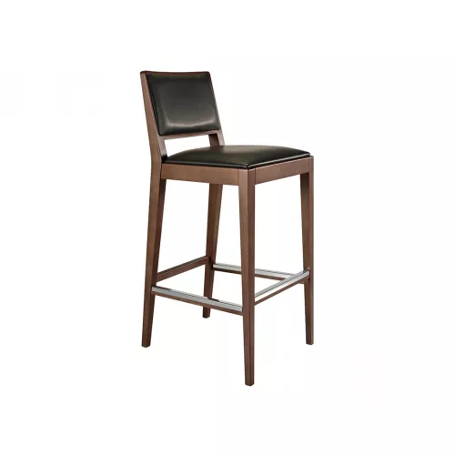 The Cassie BK barstool combines a classic design with superior comfort and durability. Its beech wood frame, available in multiple stain finishes, features a wooden footrest with metal protection. The upholstered seat and backrest, offered in professional fabrics or faux leather, make it ideal for bars, event halls, and other horeca settings.