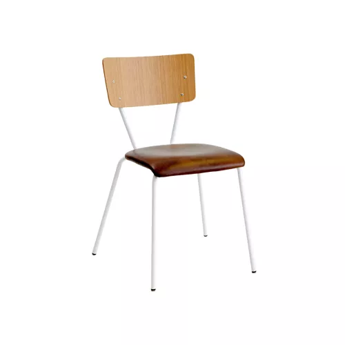 The Clyde chair features a strong metal frame paired with a wooden seat and backrest, combining durability with a natural look. The wood elements are available in a variety of stains, while the frame can be customized in any RAL color, making Clyde a versatile option for horeca environments seeking both style and flexibility.