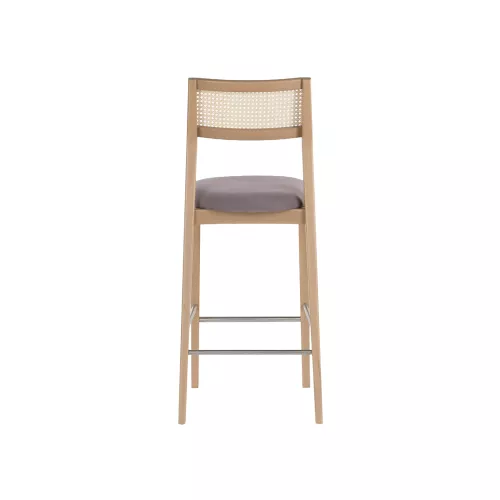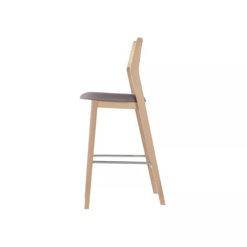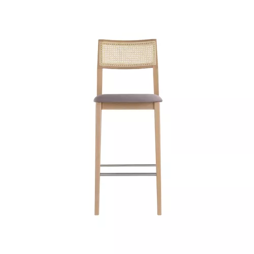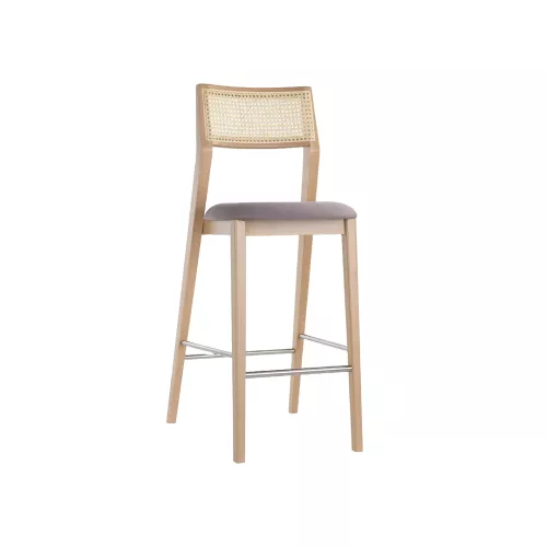 The Daisie BK barstool combines timeless elegance with practical design. Its solid beech wood frame, available in various stain finishes, pairs perfectly with a metal footrest for lasting comfort. The upholstered seat—offered in premium fabrics or faux leather—complements the refined cane backrest. Ideal for bars or any horeca setting.