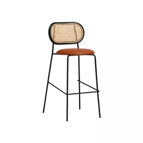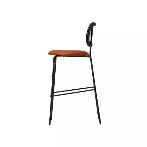 Fortune BK is a refined barstool featuring a durable steel frame, an upholstered seat, and a stylish cane backrest. Upholstery options include a broad selection of professional fabrics or faux leather designed for intense wear. Equipped with a metal footrest, it fits perfectly in bars and horeca venues, blending seamlessly with various interior design styles.