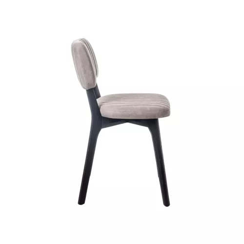 The Hyperion 2S chair is designed for restaurant use, featuring a durable beech wood frame finished with polyurethane lacquer for long-lasting wear resistance. The seat includes high-density foam for comfort, and the upholstery is available in various fabrics or faux leather, with multiple wood stains to match different horeca settings.