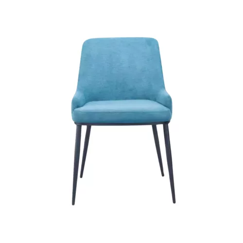 The contemporary metal chair JIM-002C is the latest addition to our metal chairs collection. The seat and backrest feature a multilayer wooden core, padded and upholstered in your choice of fabric, imitation leather, or velvet, available in several colors. As beautiful as it is comfortable, this modern chair makes a bold statement with its sleek design. The clean lines and cozy seat are just a few of the standout features. The elegant blue upholstery and refined silhouette make it a perfect fit for restaurants, cafés, and other hospitality interiors. Designed with durability in mind, the JIM-002C has a solid, long-lasting structure that withstands intensive use over time.