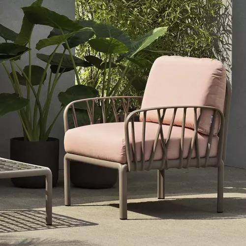 The Komodo armchair offers both style and comfort with its included cushion kit. The frame is made of uniformly colored fiberglass polypropylene resins with UV additives for durability. It’s available in various color variations: white, anthracite, tortora, and agave for the frame, with cushion options in rosa quarzo and grey. Ideal for both indoor and outdoor use, this armchair combines modern aesthetics with practical design.