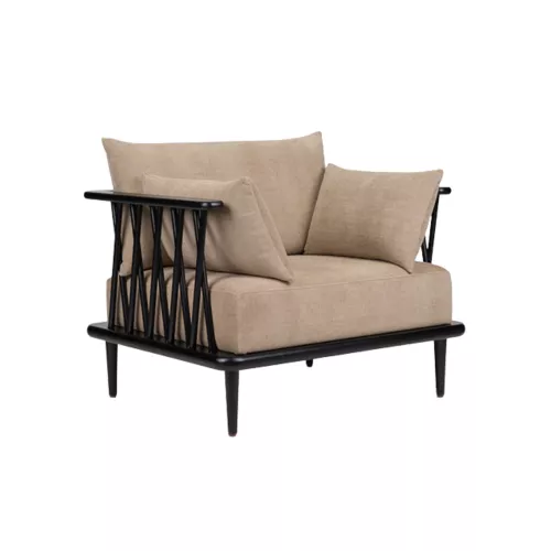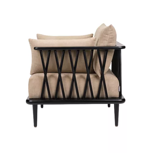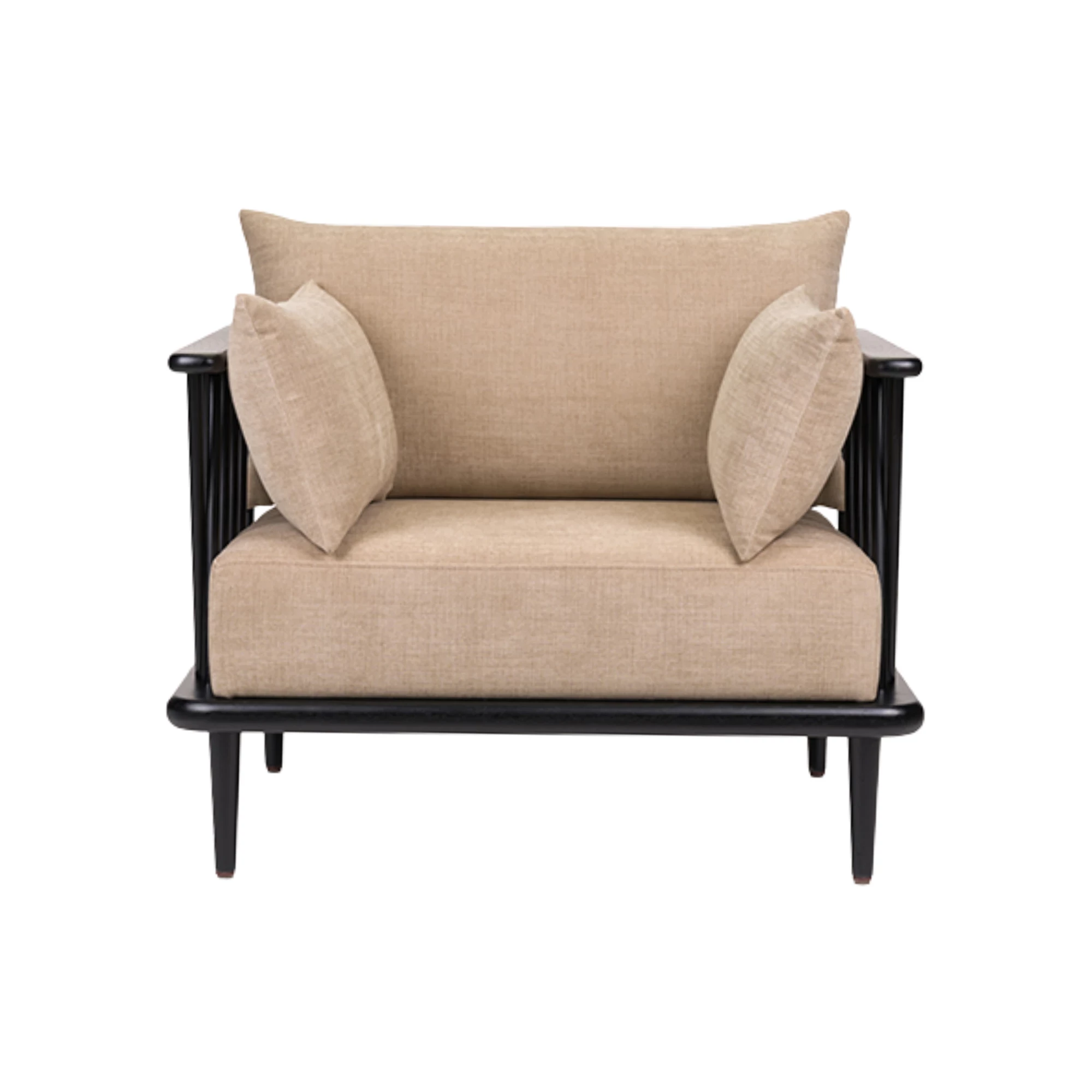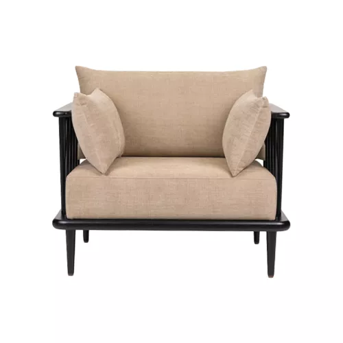 Prometeus Lounge is a calming armchair designed for hospitality interiors, inspired by the graceful verticality of bamboo forests. Its solid ash wood frame is available in various stain colors and paired with professional-grade upholstery. With a relaxed design and the option to add side pillows for extra comfort, it’s ideal for lobbies, lounges, and tranquil horeca spaces.
