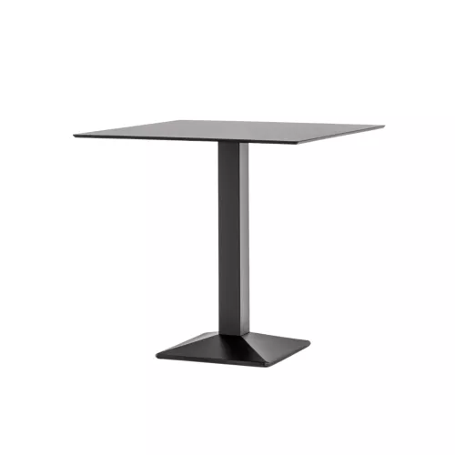 Table with a pyramid-shaped base in powder-coated, sand-blasted cast iron, paired with a steel tube column. Available with square tops in a variety of sizes and finishes.