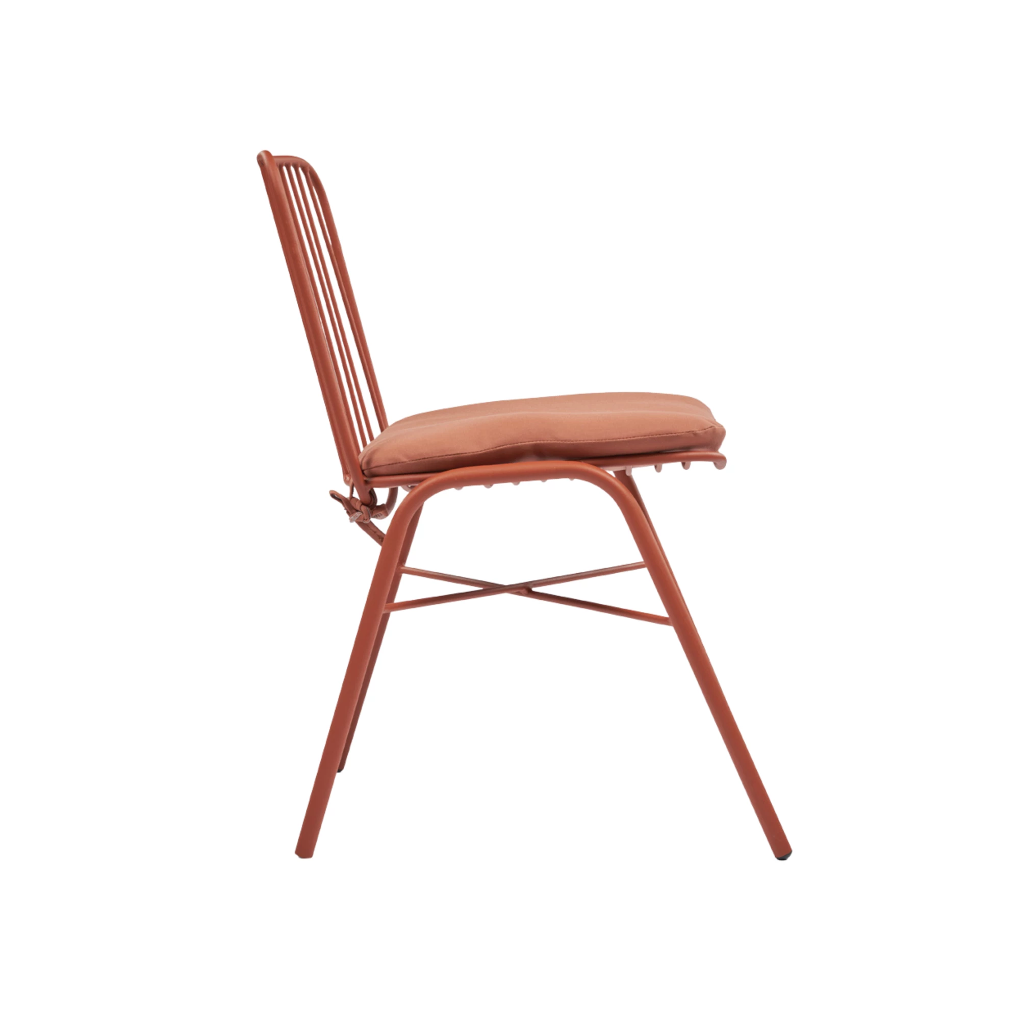 Outdoor chair with a metal frame and a comfortable seat cushion, designed for hospitality terraces and outdoor dining areas. The slender vertical lines of the backrest create a light and balanced appearance, while the sturdy metal structure ensures durability in intensive use environments. Suitable for cafés, restaurants, patios, and terrace seating areas where both comfort and practical design are required.