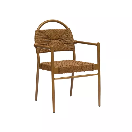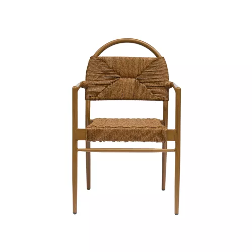 Aluminum armchair with a rattan weave, designed for outdoor hospitality use. Lightweight and durable, suitable for terraces, cafés, and restaurant outdoor spaces.